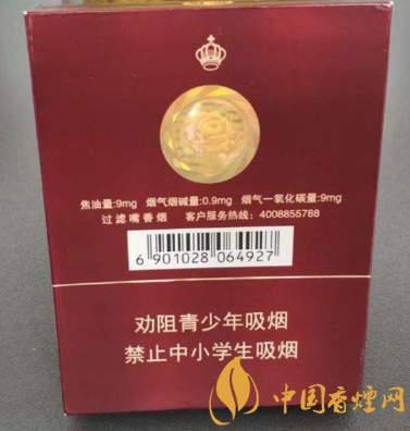 焦油含量9mg,煙氣煙堿量0.9mg,煙氣一氧化碳含量9mg;條盒條形碼6901028064934,條包條形碼6901028064941。