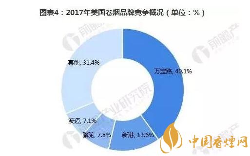 目前,美國(guó)市場(chǎng)上主要有四家大的卷煙制造商:菲莫國(guó)際、雷諾茲煙草公司、帝國(guó)品牌公司以及利格特邁爾斯煙草公司。2017年,菲莫國(guó)際在美國(guó)的市場(chǎng)份額為44.5%,較上年下降了2.1個(gè)百分點(diǎn);雷諾茲煙草公司的市場(chǎng)份額為34.5%,同比上升0.8個(gè)百分點(diǎn);帝國(guó)品牌公司市場(chǎng)份額增長(zhǎng)了0.1個(gè)百分點(diǎn),至8.9%;利格特邁爾斯煙草公司的市場(chǎng)份額增加了0.1個(gè)百分點(diǎn),至3.7%。