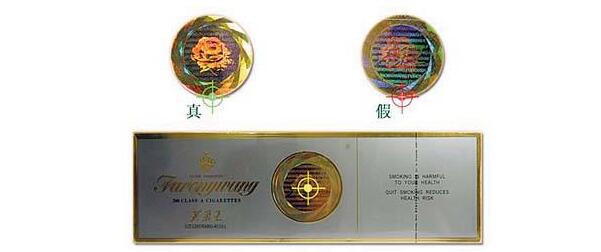 (2)看防偽標(biāo)記:條盒的正面芙蓉花防偽標(biāo)記,真煙的印刷在同一側(cè)面看到的只有一個圖樣;假煙的印刷在同一側(cè)面看到是幾個在一起的圖樣。