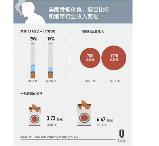 根據市場調研公司的報告,2001 年至 2016 年期間,美國香煙的銷售數量減少了 37%,與此同時,美國吸煙人口的比例也下降了,但煙草公司的利潤卻上升了。在2016 年,美國煙草行業(yè)的利潤達到了 184 億美元。(跟我國一比這好像都不算什么了)