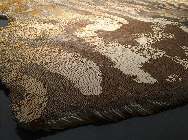 這件巨大而厚實的“虎皮地毯”鋪陳,是由50萬支重達440磅的香煙按照特殊的排列組成的驚人之作。為了突出全球貿(mào)易、包裝和人們是如何被致命的吸煙習(xí)慣所誘惑,56歲的徐冰經(jīng)過十年探索花上十年的時間去制作……,最終創(chuàng)作出此作品。