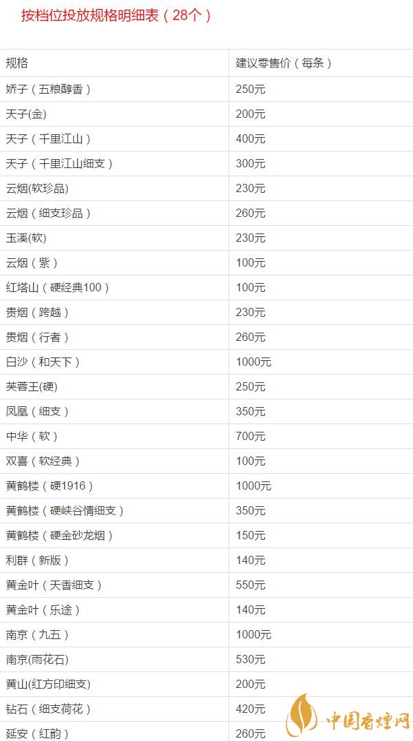 D類:嬌子寬窄逍遙、嬌子寬窄逍遙細支、嬌子紅韻新、鉆石荷花、云煙軟大重九、白沙細支和天下、天子壹號。參考價段為:單條批發(fā)價380元及以上共4個價段。
