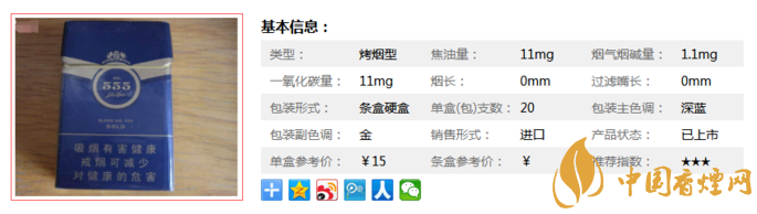 以上便是由香煙網(wǎng)小編為大家介紹的關(guān)于555配方555·金多少錢一包 555配方555·金的價格及圖片的相關(guān)信息,想要了解更多有關(guān)內(nèi)容請點擊:藍色555香煙多少錢一包 藍色555煙價格表和圖片