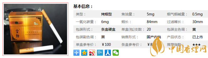 | 類型 :烤煙型 | 焦油量 :5mg | 煙氣煙堿量 :0.5mg | 一氧化碳量 :6mg |
