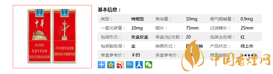 | 類型 :烤煙型 | 焦油量 :10mg | 煙氣煙堿量 :0.9mg | 一氧化碳量 :10mg |