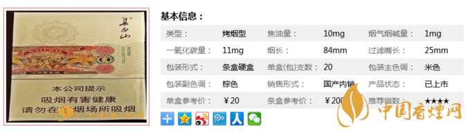 類型 :烤煙型 焦油量 :10mg 煙氣煙堿量 :1mg 一氧化碳量 :11mg