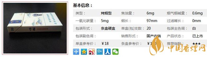 | 類(lèi)型 :烤煙型 | 焦油量 :6mg | 煙氣煙堿量 :0.6mg | 一氧化碳量 :5mg |