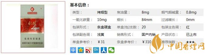 類型 :烤煙型 焦油量 :8mg 煙氣煙堿量 :0.8mg 一氧化碳量 :10mg