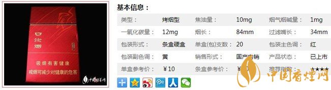 | 類(lèi)型 :烤煙型 | 焦油量 :10mg | 煙氣煙堿量 :1mg | 一氧化碳量 :12mg |