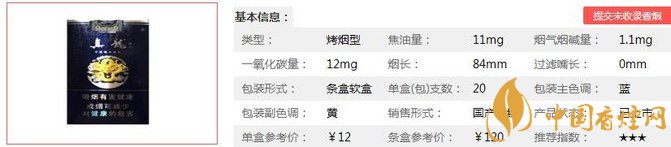 | 類型 :烤煙型 | 焦油量 :11mg | 煙氣煙堿量 :1.1mg | 一氧化碳量 :12mg |