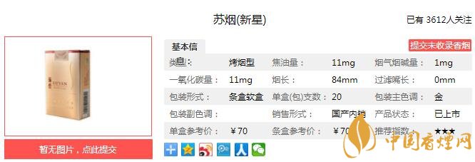 蘇煙(新星)和蘇煙(天星)是“蘇煙”全新推出的“星系列”的兩個原創(chuàng)型產(chǎn)品;這兩款“星系列”的主力規(guī)格共同承載“蘇煙”通過主銷價區(qū)向上延伸力爭實現(xiàn)提升品牌價值的戰(zhàn)略意義,并以此來鞏固和提升“蘇煙”在高端消費者心目中所具有的“高端身份”的價值認知。經(jīng)香煙網(wǎng)小編市場調(diào)查蘇煙新星售價為70元/包。