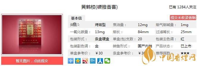 黃鶴樓(硬雅香喜)煙支長84mm,過濾嘴長25mm。黃色濾嘴上影印了與煙盒相同的文字圖案,濾嘴下端,豎排印刷的品名“黃鶴樓”與黃鶴樓的圖標分居前后兩側,“Huanghelou”的拼音則印在一條較粗的紅圈上。下面我們一起來看黃鶴樓(硬雅香喜)的參數(shù)信息:焦油量:12mg 煙堿量:1.0mg 一氧化碳量:13mg