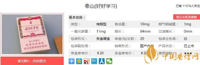 泰山香煙這兩年來還是比較活躍的,推出了不少新品香煙,不管是味道還是品牌形象都是有提升很多的。但是好像沒什么令人印象深刻的產(chǎn)品,這一款也算是其中比較能夠打響品牌的香煙吧。泰山好好學(xué)習(xí)售價是在20元/包,總體來說性價比還是可以的。