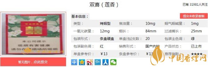 雙喜(蓮香)的過濾嘴設(shè)計也很清新脫俗,淺色的煙嘴配上雙喜的logo。從煙支的煙絲端觀察,煙絲顏色深黃,沒有梗夾雜其間,抽一口焦油量也在接受的范圍之內(nèi),總體呈現(xiàn)的效果比較好。下面便是這款香煙的基本參數(shù)如下:焦油量:10mg 煙堿量:1mg 一氧化碳量:12mg.