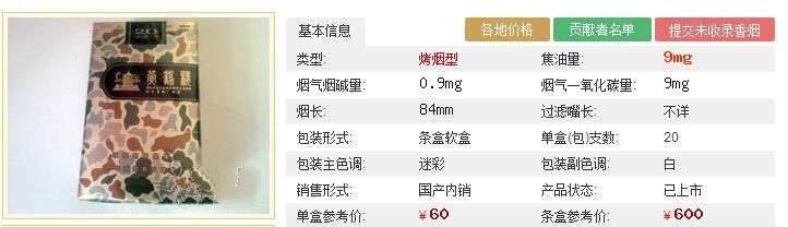 黃鶴樓香煙大彩(硬)綜合應(yīng)用國(guó)內(nèi)多產(chǎn)區(qū)煙葉,凸顯立體吸味。在配方技術(shù)上,充分利用增香功能薄片、亮色煙等復(fù)合配方技術(shù),在豐富了產(chǎn)品香韻,降低焦油至6毫克。黃鶴樓大彩的煙支采用了焦油標(biāo)尺刻度,消費(fèi)者可以輕松了解并掌控?cái)z入的焦油含量。采用大漠迷彩紋飾,賦予產(chǎn)品特別的身份象征,與其他產(chǎn)品形成天然的視覺(jué)區(qū)隔,帶、一股特別的時(shí)尚硬朗氣息。