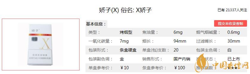 以上就是由香煙網(wǎng)小編為大家整理介紹的關于嬌子X香煙的價格的相關內容介紹。由于各地經(jīng)濟水平不同,香煙的價格有些許差異。你所在的地區(qū)這款香煙最新價格是多少?歡迎大家在評論區(qū)留言告訴小編哦。