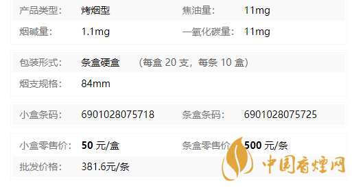 類型 :烤煙型 焦油量 :11mg 煙氣煙堿量 :1.1mg 一氧化碳量 :11mg