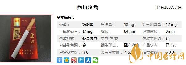 廬山煙1957多少錢一包 廬山(鴻運)香煙價格6元/包