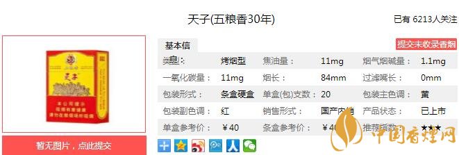 天子五糧香30年包裝盒正中間是稻谷、小麥、玉米、高粱、大豆的圖案,也就是所謂的內(nèi)含五糧香珠的“五糧”,香煙吸味上純粹五糧香,口感甘甜、味道醇厚,深受廣大煙民的喜歡。經(jīng)香煙網(wǎng)小編市場調(diào)查天子五糧香30年售價為40元/包。