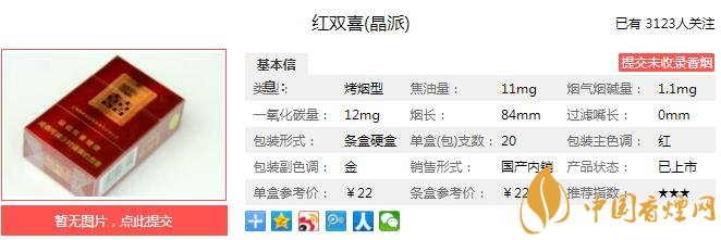 南京炫赫門煙支長84mm,晶心選材、晶致配方、晶湛工藝鑄就了晶派內(nèi)在品質(zhì)的卓越不凡。城市氣派、晶英氣派、喜慶氣派彰顯了晶派外在包裝的魅力無窮。下面我們一起來看紅雙喜晶派的參數(shù)信息:焦油量:11mg 煙堿量:1.1mg 一氧化碳量:12mg