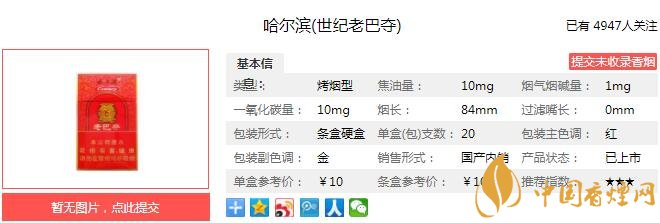 哈爾濱老巴奪煙支長84mm,過濾嘴長25mm,使用從植物中提取的天然香原料和天然植物保潤技術,保證卷煙舒適感;以清甜香風格為基礎,采用創(chuàng)新性中支(7.0mm)規(guī)格,在保證滿足感前提下,注重煙香的醇和感、舒適感和甜潤感,同時兼顧卷煙安全性。下面我們一起來看哈爾濱老巴奪的參數信息:焦油量:10mg 煙堿量:1.0mg 一氧化碳量:10mg