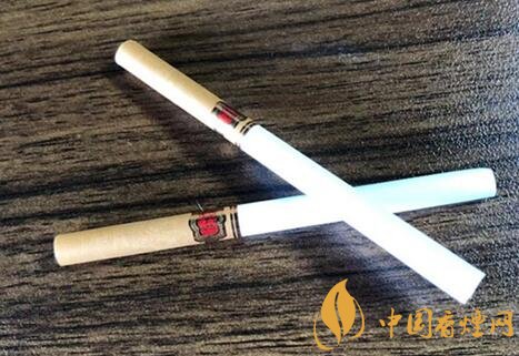 撕掉內(nèi)襯紙,可以看到煙支是10-10的排列,煙支長87mm,過濾嘴長37mm,細觀煙支,切口整齊,煙支小巧精美,握在手里舒適度強。暗黃色帶有反光顆粒的過濾嘴上印著與外盒相輝映的金腰帶圖形,只不過祥云底色改為紅色。煙支相接處有兩條粗細不一的金色圓環(huán)圍繞。小小一只濾嘴上用了那么多印刷工藝,精細的同時,成本也不低。