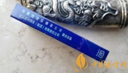 煙盒正反版面一樣,上蓋位置有雪峰日照金山,彌漫的云霧拱衛(wèi)金頂。只是細(xì)支的這個(gè)圖片質(zhì)量不太理想。煙盒的中部是金色藏文書寫風(fēng)格的“雪域”字樣。居中,有藍(lán)色的蓮花座圖案。下有銀色小字——西藏自治區(qū)煙草公司總經(jīng)銷。