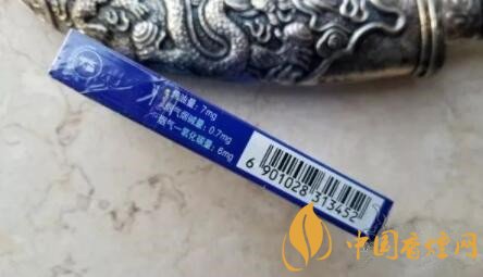 煙盒的左側(cè),標(biāo)識(shí)有這款的理化指標(biāo),7mg的焦油含量,中規(guī)中矩,不算細(xì)支里標(biāo)稱值最高的。