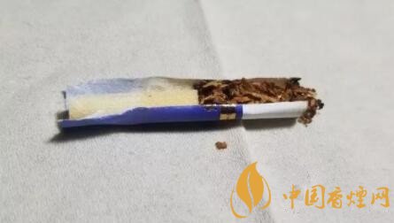 剖開濾嘴,絲束長(zhǎng)度并不長(zhǎng),14mm左右。降焦孔正好在絲束的中部位置。水松紙內(nèi)部還襯有一層類似綿紙的細(xì)軟質(zhì)層。絲束的顏色比較淺,前段稍稍變黃一些。整段顏色均勻。