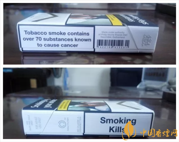 警示圖片的內(nèi)容,與84S紅或白等相同。從樣式上可以看出,它也是一款新版萬寶路。與84S系列相同的,是因為讓位于警示圖片,黑框警示英文字句,轉而移到煙盒的左右側面。#p#副標題#e#