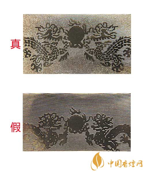 真煙小盒正面龍紋和松枝印刷清晰,色彩飽和度高,有立體感;假煙小盒正面龍紋和松枝印刷模糊,無(wú)立體感,且有粗糙圓形圖案。