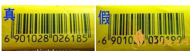 真品小盒條形碼字體和條形碼邊緣均為明顯的鋸齒狀,字體較細(xì)小;假煙則無(wú)真品特征,而且字體較粗。