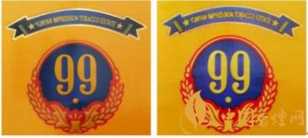 真品卷煙:1.商標LOGO稻穗圖案凸起,整體立體、飽滿,大豐收。2.99數(shù)字筆畫圓潤、飽滿,下面圓點尤為突出。3. 藍色底紋顏色重,邊緣向中間色彩過渡自然。4.商標紙流水紋路清晰可見。