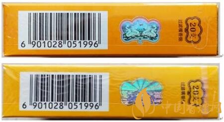 真品卷煙:花紋圖案燙金色彩明亮,線條凹陷鑲嵌在商標紙上。