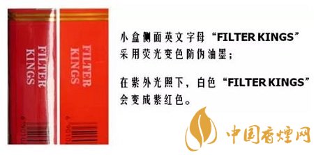 光變防偽涂層——小包側(cè)面“FILTER KINGS”字樣,經(jīng)陽(yáng)光直射或紫外光照射后由白色變成紫紅色,停止照射后,紫紅色會(huì)逐漸消退。