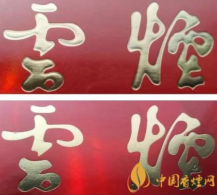 真品卷煙云煙字體燙金印刷明亮、清晰、完美。字體筆畫中間凸起,邊緣凹陷,字體飽滿,整體立體感強(qiáng)。側(cè)光觀察商標(biāo)紙表面呈現(xiàn)磨砂狀,紅色線條凸起。該款假冒卷煙云煙字體燙金印刷顏色暗,筆畫燙金掉金。字體筆畫整體平,無立體感,印刷較為粗糙。側(cè)光觀察商標(biāo)紙表面無磨砂狀,紅色線條平。(上真下假)