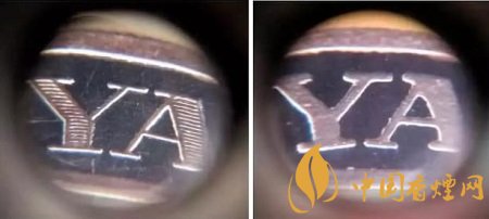 真品卷煙金腰帶頂部YUNYAN拼音,筆畫內(nèi)有橫線條痕跡。該款假冒卷煙字母筆畫內(nèi)無橫線條痕跡。圖4左真右假(左真右假)