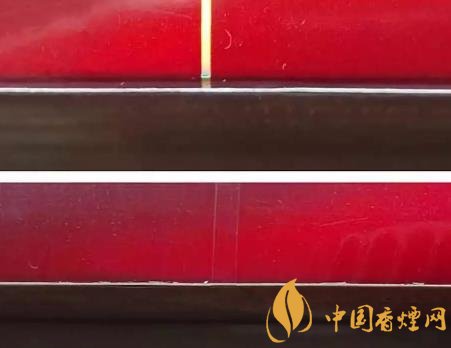 真品卷煙商標(biāo)紙邊緣裁切干凈、光清,無毛邊。該款假冒卷煙商標(biāo)紙邊緣裁切粗糙,毛邊多。(上真下假)