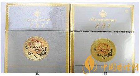 假冒卷煙“芙蓉花”圖案立體感不強,金色長方形外邊框上無細小壓痕。