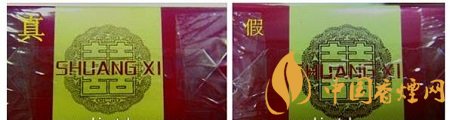 如圖所示:真品商標(biāo)紙顏色為深紅色,正面喜字燙金邊緣凸起感明顯;假煙商標(biāo)紙顏色多為鮮紅色,正面喜字為平版印刷且邊緣未見(jiàn)凸起感。(左真右假)