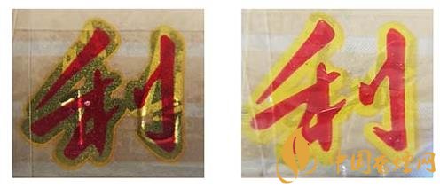 假冒卷煙:該款假冒卷煙激光全息防偽圖案暗淡無光,圖案無分層;兩側“三潭印月”都暗淡。上真下假