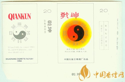 由于“乾”“坤”兩卦在八卦中占有特別重要的地位,因而河北石家莊卷煙廠曾于上世紀80年代出品了“乾坤”煙標,其主、副版于太極八卦圖下方,還分別用中英文印有出自《易傳·系辭上傳》的“易有太極、是生兩儀。兩儀生四象、四象生八卦”。