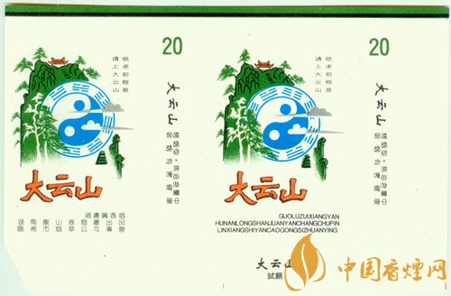 “太極八卦”在為道教所利用的同時,道家還認為“太極八卦”有神通廣大、鎮(zhèn)懾邪惡的功效。因而以道教名山為主題的煙標就少不了“太極八卦圖”。 上世紀80年代,湖南龍山卷煙廠出品的“大云山”煙標,主、副版不僅突出描繪了青翠欲滴的大云山峰,而且凸顯出“太極八卦圖”,同時在其右上方還印有“欲求前程景 請上大云山”字樣。
