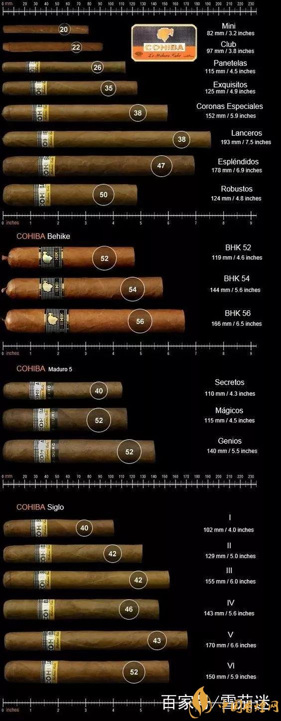 哈伯納斯旗下的 27 個(gè)古巴品牌雪茄,長(zhǎng)度基本在 100mm-230mm 之間,環(huán)徑基本在 10.4-22.8 mm之間。