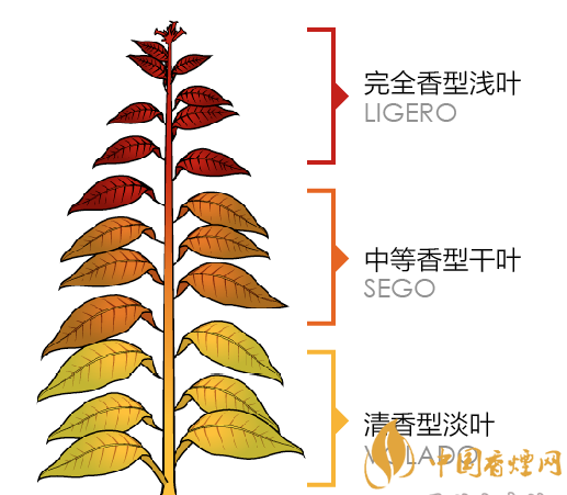 完全香型淺葉(LIGERO)——緩慢燃燒的淺葉,具有三級香氣濃度。