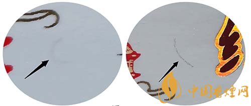 假冒卷煙:該款假冒卷煙彩色纖維絲清晰,纖維絲印刷在商標紙表面。圖4左真右假