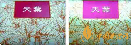 真品天葉卷煙此處圖案,煙葉根莖、葉脈圖案顏色正常且清晰,尤其是煙葉尖端脈絡(luò)清晰可見;而假煙此處圖案,根莖、葉脈有重疊、模糊不清現(xiàn)象。