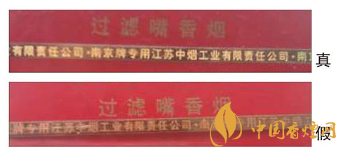 看小盒拉帶。真品“南京”(紅)拉帶上字體清晰,光澤鮮艷,字體里有許多細(xì)小的水平紋路。假煙筆畫較粗,光澤暗淡。